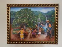 Tela retrata um piquenique. Lado direito da tela, árvore frondosa com folhas verdes e flores em tons de amarelo e laranja. Sobre os galhos, pássaros e borboleta em tons de azul e amarelo. Sob a árvore, recostado ao tronco, casal abraçando-se, o homem veste camisa laranja, calça azul, tênis azul e branco, a mulher descalça com vestido em amarelo e branco com braços abertos. Violão encostado na árvore em marrom e roupas dependuradas num dos galhos nas cores azul, amarelo, vermelho e branco. Sobre um chão, em tons de marrom e ocre, folhas em tons de verde, ocre, marrom e cinza e sandálias, tamancos e tênis nas cores branca, amarelo e azul, toalhas em tons de verde e cinza com cestos nas cores ocre e cinza. Sobre as toalhas de mesas sanduiches, latas e garrafas de bebidas em tons de verde, laranja, cinza e marrom. Lado esquerdo, sobre um tronco, homem sem camisa descalço vestindo calção lilás, conversa com mulher de cabelos longos de vestido rosa e verde. Um lago com cascata em azul e branco estão várias figuras humanas tomando banho. O lago é cercado por pedras em tons de marrom com figura humana sentada sobre as mesmas e ao fundo aparece à abertura de uma gruta. Perto da margem do lago coqueiro em tons de cinza, verde com cacho de coco em verde. Em tronco de arvore com poucos galhos verdes e pequenas frutas vermelhas, e um ninho de joão de barro com pássaro na entrada nas cores laranja e amarelo. Arara num galho nas cores laranja, vermelho, amarelo e azul e dentro do orifício do tronco, coruja em lilás. Ao fundo copas de arvores em tons de verde e azul. Céu em tons de azul, branco e lilás.