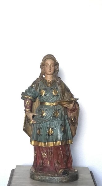 Imagem de pé, nariz aquilino, carnação clara; cabelos ondulados que caem mechas sobre os ombros. Corpo ligeiramente voltado para a esquerda e apoiado sobre perna direita; perna esquerda flexionada para frente, deixando-se ver a ponta do sapato preto; braço direito ligeiramente flexionado com a mão segurando sobre túnica; braço esquerdo flexionado para frente com mão segurando prato dourado. Túnica vermelha com mangas compridas, caindo pregas verticais decoradas por flores douradas. Sobre túnica azul com mangas que vão até a altura do cotovelo; cintura marcada com faixa dourada; gola, manga e barra contornada de dourado; flores douradas. Na cabeça véu contornado em dourado com decoração de flores douradas. Base circular simples.