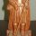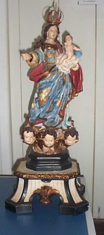 Imagem de pé; nariz aquilino, carnação clara; cabelos ondulados que caem em mechas sobre as costas. Corpo ligeiramente voltando para esquerda. Braço direito estendido para frente com mão fechada; braço esquerdo flexionado sobre o corpo com mão espalmada segurando o pano e sobre este o Menino Jesus sentado. Túnica branca com mangas compridas e orla em marrom; sobre túnica azul com mangas compridas e cintura cingida, caindo pregas verticais formando ondulações na parte inferior, gola redonda marrom dourada e com florões dourado por toda túnica. Manto azul com parte interna em vermelho com borda e florões dourados que passa por baixo do braço direito formando larga prega na parte lateral, sendo recolhido no braço esquerdo. A imagem está apoiada sobre nuvens com três cabeças de anjos. Base retangular em dois planos e chanfrada nos cantos. Peanha pintada de branco e azul; com tampo retangular contornado de dourado. Base recortada formando quatro pés; nos recortes florões dourado.