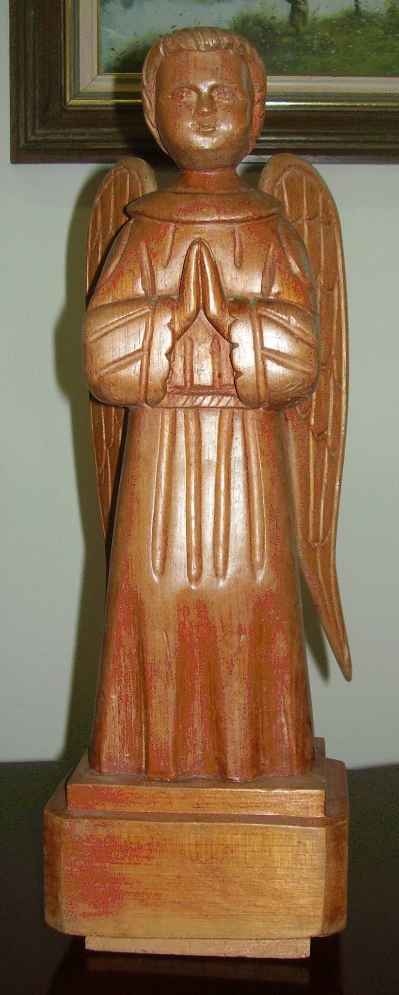 Imagem de pé com mãos postas , rosto redondo, olhos abertos, nariz achatado e boca pequena e fechada. Cabelos curtos com franja. Hábito comprido com pregas, gola larga redonda. Nas costas duas asas. Base alta quadrada e lisa.