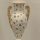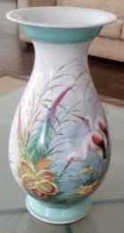 Vaso em porcelana branca. Base circular pintada de verde. Bojo com pintura, na parte central de ramalhete, de dois pássaros em um lago, o que está em primeiro plano, está bebendo água. Ao redor dos pássaros, folhagens e flores amarelas. Próximo a boca, larga faixa pintada de verde; borda lisa; filetes em dourado. Sem marca.