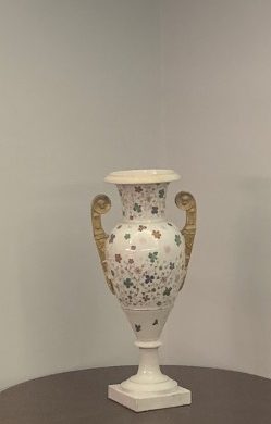 Vaso em porcelana branca, sobre base retangular. Base circular com fuste liso, terminando em anel. Bojo dividido em duas partes por um friso: a parte inferior com flores e a parte superior com muitas flores em toda a extensão do bojo. Gargalo com a mesma decoração do bojo; Boca com borda lisa e em dois planos. Asas em dourado com extremidade superior terminando em círculos. Sem marca.