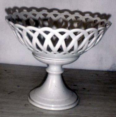 Fruteira em porcelana branca, em duas partes unidas por parafuso. Pé com base circular em dois planos; fuste liso, em forma de cálice invertido, tendo ao meio anel. Copa vazada, formando uma espécie de traçado; borda recortada. A copa prende-se a base através de um parafuso. Sem marca.