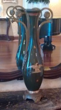 Ânfora em porcelana verde, sobre base de metal. Pequena base circular pintada de ouro. Bojo tendo na parte central águia com asas abertas; com pequenas flores nas duas faces da peça. Boca com borda circular e contornada com duas ordens de friso dourado. Asas apostas, em hastes de metal dourado, que parte do bojo e vai além da borda e termina em voluta voltada para dentro, com rosácea; e outra menor, que sustenta a maior, terminando em folha estilizada. Sem marca.