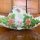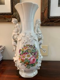 Jarro em porcelana branca. Base circular, ligeiramente recortada. Bojo, com folhas em alto relevo dispostas na lateral: na parte anterior, ao centro, ramalhete. Alças formadas por grotescos. Boca com borda recortada dividindo o gargalo em gomos. Na frente os N° 55 e 1.