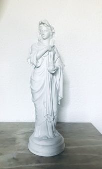 Figura mitológica, de pé, porcelana branca. Cabeça voltada para esquerda, nariz aquilino; mão direita segurando recipiente; braço direito flexionado sobre o corpo com a mão empunhada sobre o colo; ponta do pé esquerdo aparente; cabeça com coroa de folhas. Indumentária: veste longa e manto com capuz que recobre parte da cabeça. Base circular em dois planos.