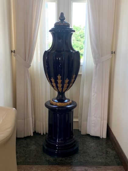 Potiche com coluna em faiança branca pintada de azul. Potiche: base circular com cinta de folha em dourado; parte encava desprovida de decoração; bojo em forma de balaústre, com caneluras afuniladas com parte inferior com flores em dourados dispostas em ramos com quatro e três flores; próximo ao gargalo, nas arestas das caneluras folhas estilizadas em um tom de azul mais claro. Gargalo com caneluras. Boca com borda circular com relevos; tampa dividida por volutas dourado e elementos em azul; borda lisa com friso azul; pegador à feição de pinha. Coluna: com capitel simples e fuste com caneluras. A coluna repousa sobre base circular azul.