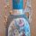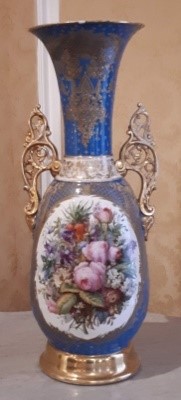Jarro em porcelana branca pintada de azul. Base circular pintada de dourado. Bojo piriforme com reservas brancas contornadas elementos naturalistas em dourado; entre o gargalo e o bojo cinta de branca com elementos fitomorfos. Gargalo alto e com ornatos de ramículos em dourado e friso. Boca com borda lisa e contornada com friso dourado. Parte posterior do jarro, flor com oito pérolas em dourado e outras pequenas flores por toda a extensão do bojo; os elementos decorativos em dourado são em relevo. Asas douradas recurvas e recortadas.