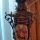 Lampião de mesa. Base em bronze vazado, recortado, cinzelado e burilado, com volutas, feixe de plumas, friso perolado, conchas e peixes. Corpo em porcelana de branca pintada de azul; parte inferior com frisos dourados e vermelhos; no centro, reserva oval circundada por frisos dourado com pintura de cena do cotidiano (figura feminina sentada próxima a beira de um largo);em volta da reserva todo o corpo é decorado com caminho sem fim; na lateral, folhas estilizadas; na parte superior, duas cintas brancas com filete vermelho e delimitada por filetes dourados; entre as cintas, ornatos de ramicelos; parte posterior, reserva com flores. Parte superior da lampião em bronze recurvado com decoração de flores e folhas. Cúpula de vidro com flores lapidadas e reservas com flores estilizadas.