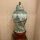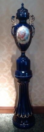 Potiche em porcelana branca pintada de azul. Base campaniforme com borda circular. Bojo piriforme com reserva branca com cena galante; asas recurvas e com douramento; tampa com pegador em forma de pinha. O Potiche está assentado em uma pequena base decorada com reserva branca, tendo ao centro pintura de cena galante. Coluna em forma de jarro, com caneluras com contorno dourado; base circular.