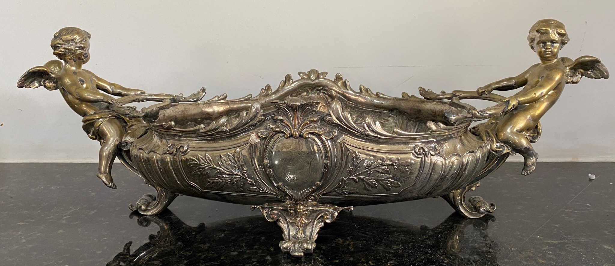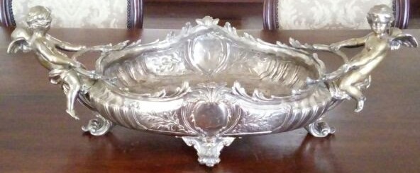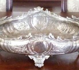 Floreira em formato oval com 04 pés suspensos em formato de folhas. Na parte central da frente rocalha gravada brasão do Estado do Maranhão, ladeada por ramagem e gomos. Borda decorada com folhas. Nas laterais esculturas de anjos sentados no que é continuação dos pés, seguram haste em formato de ramagem.