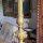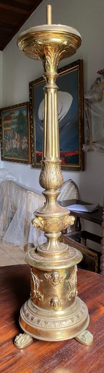 Tocheiro em metal dourado tem pés em formato de garra, base em formato redondo com decorado com ornatos óvalo, acima símbolos eucarístico formado por dois braços que se cruzam: um nu e outro em que aparece manga de vestimenta, mais acima uma cruz latina e acima rocaille. Ao lado do símbolo 4 anjos, sendo dois de cada lado. Haste formada por 3 anjos, mais acima fuste com rocaille, em cima haste é marcada por gomos. A parte inferior da base que sustenta a vela é decorada com folhas de rocaille.