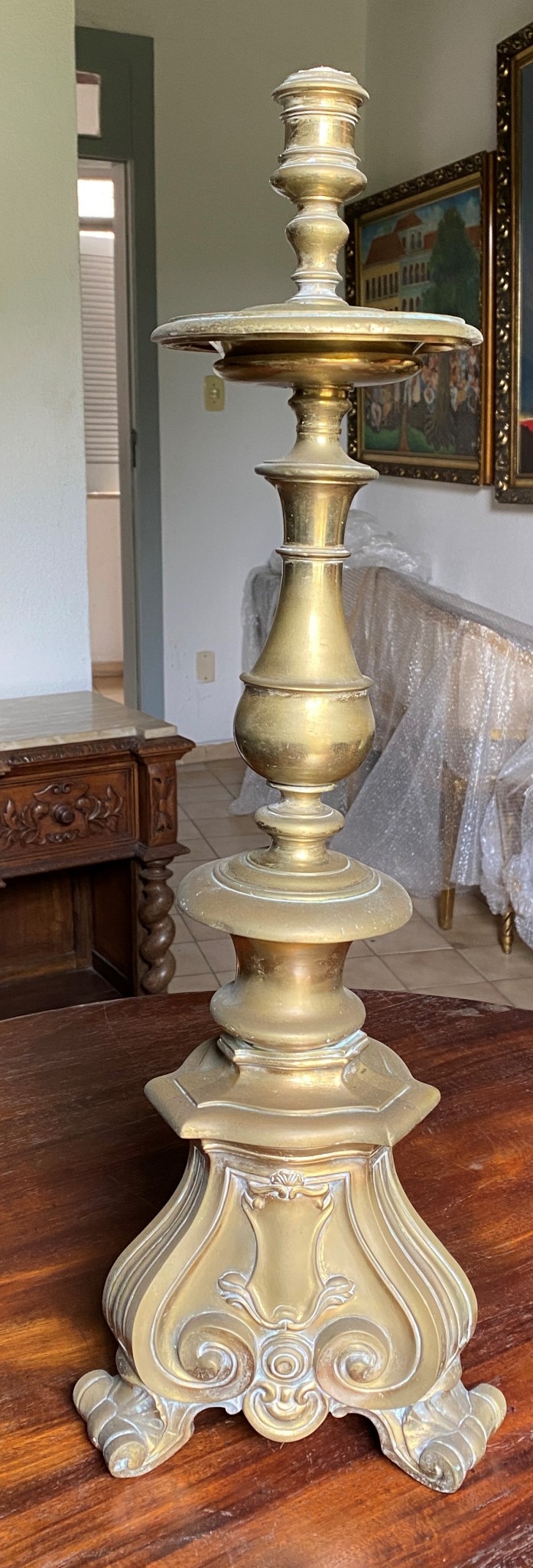 Par de tocheiros em metal dourado com pés suspensos decorado com concha e terminando em voluta virada para dentro. Base em formato triangular com duas volutas que servem de base para elemento ao centro que lembra um brasão com três folhas na parte superior. Base termina em elemento plano de onde começa haste para outra parte plana que sustenta haste em forma de balaústre, terminando na apara chamas e porta vela em formato de balaústre com bocal.