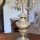 Mostruário junto à coluna em gomos, acima encimada por miniatura de vaso em formato oval, apoiado num tripé de metal decorado com guirlandas. com tampa decorada com frutas. Ladeado por esculturas de figura feminina (ninfa) no lado direito e anjo no lado esquerdo. Esculturas sobre desenhos de folhas estilizadas.