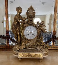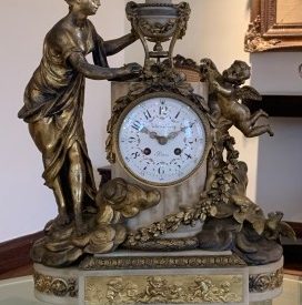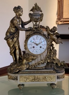 Relógio em bronze com pés redondos e suspensos, base retangular em mármore, tendo ao lado formato semicircular.