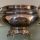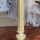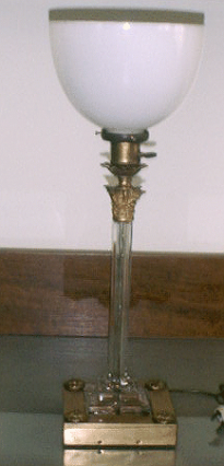 Luminária em metal com base quadrangular tendo nas 04(quatro) extremidades (parte superior) rosácea. Centro da base é de vidro com efeito interno de caneluras ao fundo. Coluna lisa, internamente decorada em caneluras, terminando num bocal com cúpula leitosa.