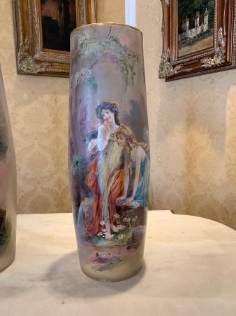 Vaso em opalina na cor branca com decoração de esmalte em alto relevo. Ambos com paisagens e figuras femininas.