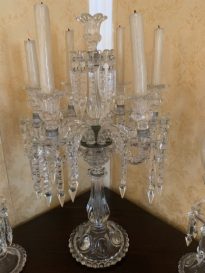Candelabro em cristal baccarat para sete velas. Candelabros em cristal, base redonda com borda em perolado decorada com 06 grandes perolas em alto relevo. Haste em gomos, de onde saem arandela central terminando em arandela com 09 pingentes, em torno, 06 arandelas com 09 pingentes lapidados a mão.